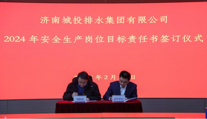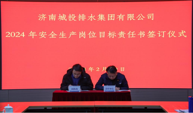会议由副总经理、安全总监朱峰主持,首先观看安全警示教育片,深刻吸取事故教训,切实提高保护人民生命安全和财产安全的能力。刘勤教与工程建设部、济南泉新生态环保科技有限公司等代表单位签订2024年安全生产岗位目标责任书。