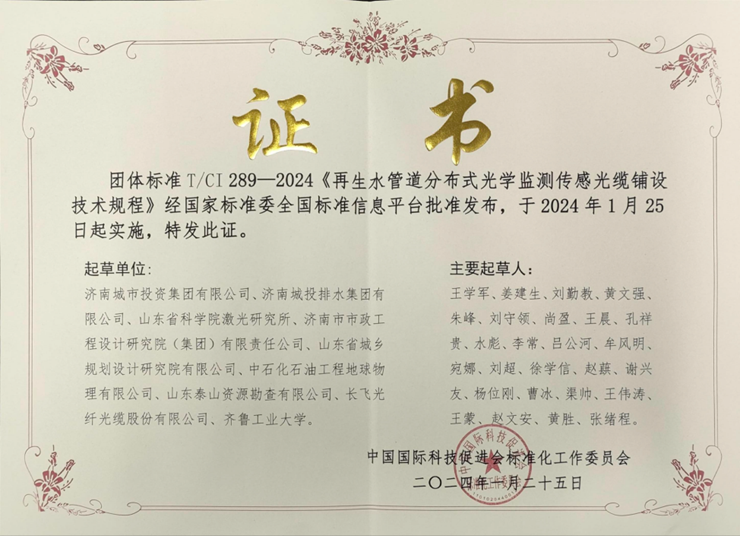 2024年1月25日,米兰官网起草编制的《再生水分布式光学监测传感光缆铺设技术规程》团体标准正式发布。