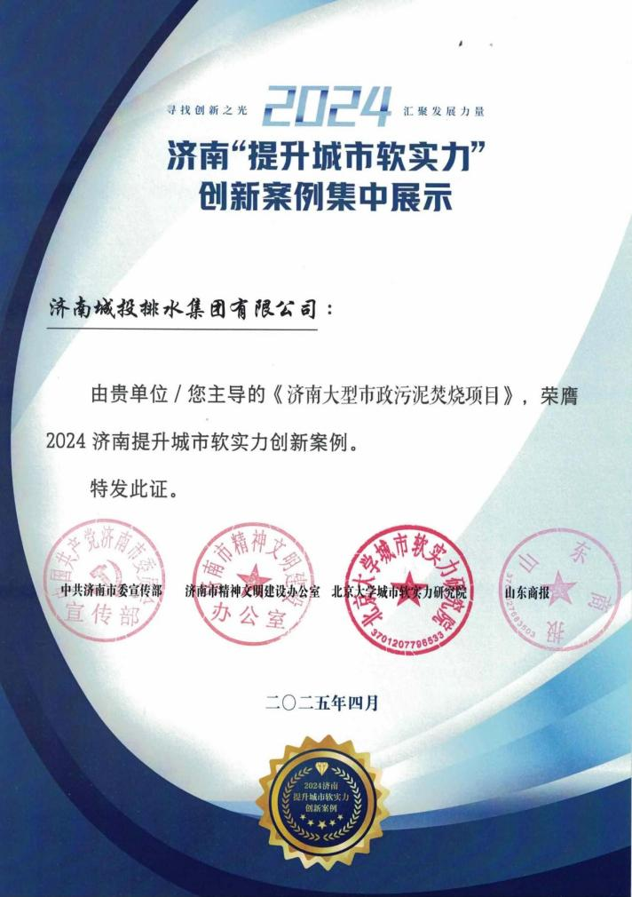 2025年4月28日,济南市污泥处置中心项目获评城市软实力创新案例,入选济南市2024年度谋划项目优秀案例。